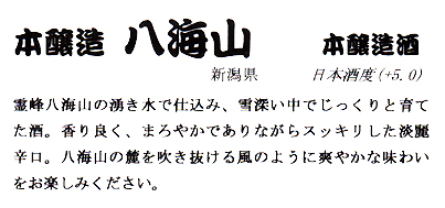 Hakkaisan Honjyozo is made from the pure water welled from Hakkai Mountain. Mild yet crisp flavor of Hakkaisan Honjyozo reflects the clear wind blowing off the sacred Hakkai Mountain.