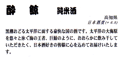 Kochi faces the Pacific Ocean, a region where the powerful Black Current flows nearby. Suigei, or "The Drunken Whale", pays homage to the magnificent king of the ocean, freely roaming in the vast ocean of the Pacific. Suigei is for the serious Sake drinker.