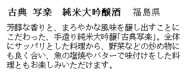 Suggested Serve with: Appetizers - Main Dish, Compliments light to rich flavored dishes: Hiyayakko tofu, stir-fried vegetables, salted grilled fish, pork ginger, butter-flavored dishes.