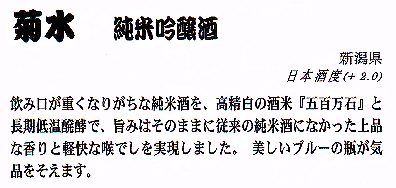 Using the exquisitely white Gohyakumangoku rice, a strain especially developed for Sake, Kikusui Junmai Ginjyo is fermented for an extended period at a low temperature. This rids the sometimes heavy character of a Junmai, and produces an elegant floral aroma and a very light palate. The elegant blue bottle is especially inviting.