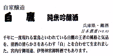 Hakutaka characterizes the grace and the noble stature of the legendary white hawk, which is said to appear once in a thousand years. Distinctly pure and clean, Hakutaka Sake has earned its distinct place as the official Sake of the Imperial court as well as the sacred Ise Shinto Shrine.