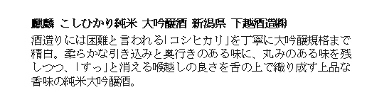 This sake has very soft flavor with elegant aroma. This amazing harmony of two is result of using Koshihikari rice, which is known as best rice in Japan.