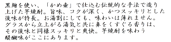 This sweet potato Shochu is made in the traditional method of fermentation in a Kame-Tsubo earthen pot. This time-honored, full bodied crisp taste will definitely tempt the palate of many generations to come.